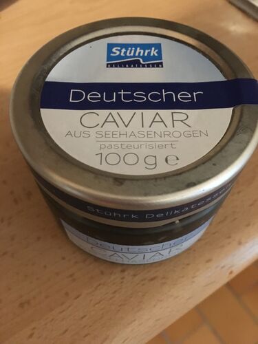 これはキャビアですが、ドイツでは魚の卵はキャビアと呼ぶので、日本で言われているキャビアとは少し違います。 なので、イクラもキャビアと書かれています。(笑) 買うときは何の卵なのかを自分で確認しなければいけません。 これはSeehaseという魚の卵の…